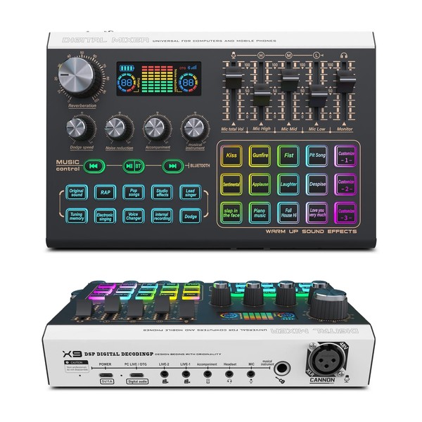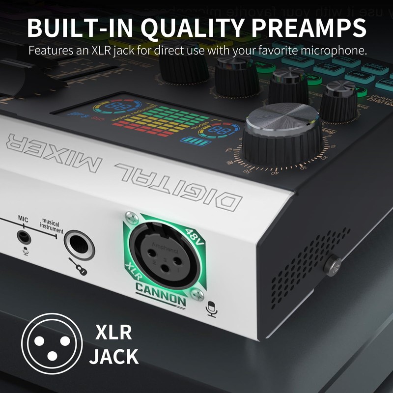 - X9 Gaming Audio Mixer features metal sharp design with LCD screen, offering studio recording tailored for live streaming and podcasting. Equipped with mic preamp and Dual DSP audio processors, xlr audio interface delivers exceptional sound with 48V phantom power. Additionally, it supports simultaneous inputs from a 6.35mm dynamic mic, 3.5mm mic, and headset mic, enabling multi person input. The podcast audio mixer also boasts Bluetooth connectivity