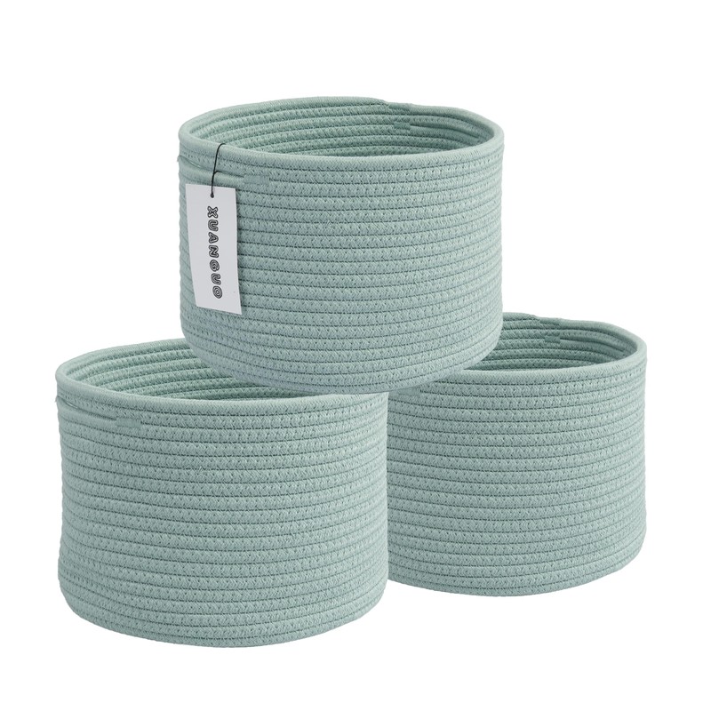 XUANGUO Woven Cotton Storage Baskets - 3-Pack Round Bins (10x10x7'') for Shelves, Closets & Bookcases | Durable Rope Organizers for Nursery, Baby, Toys, Easter & More (green)