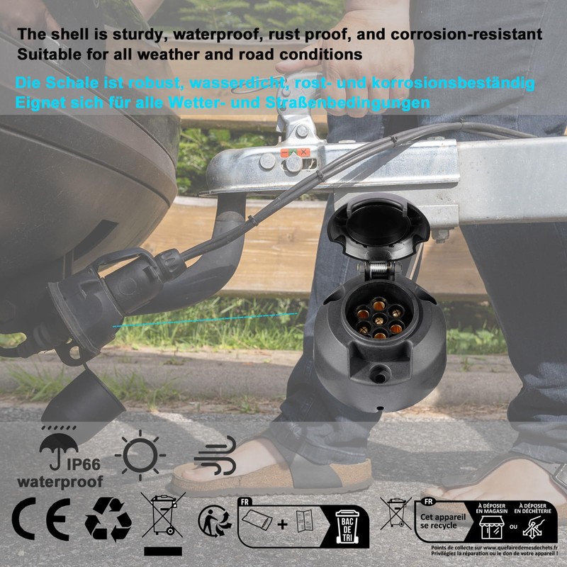 - Material quality - This 7-pin trailer socket is made of high-quality plastic nylon and brass. Copper contacts ensure optimal conductivity. The shell is durable, waterproof, rust and corrosion resistant and is suitable for all weather and road conditions.