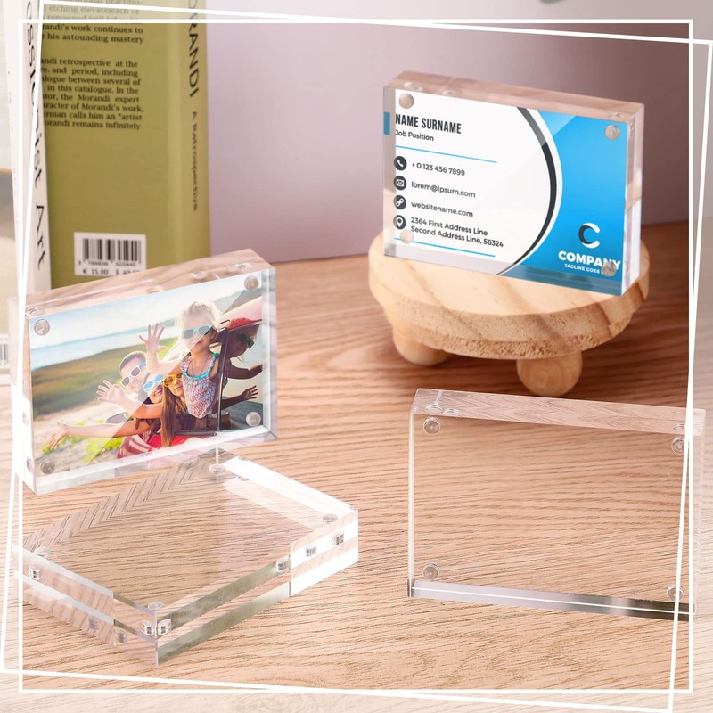 - Package Contents: you will receive 6 sets of acrylic magnetic business card frames, the 2.5 x 3.5 inch acrylic frame consists of 2 pieces of acrylic with a total thickness of 20 mm (10+10), the sufficient quantity can meet your daily use needs, or share them with family and friends; Each frame contains a film, please tear off the protective film on both sides before use