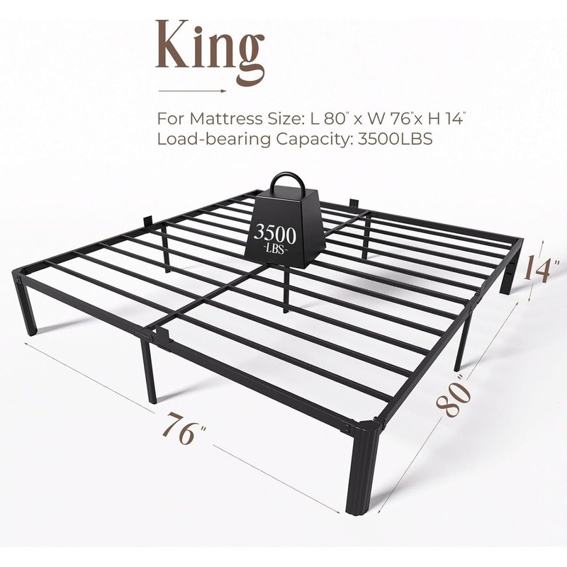 - [STURDY & DURABLE] - The king platform bed frame dimension is 80"L x 76"W x 14"H. XUKIL black metal platform bed is made of heavy-duty steel and featuring thicken metal slats and leg supports that provides a stable structure. The platform bed frame king size can support up to 3500 lbs.
