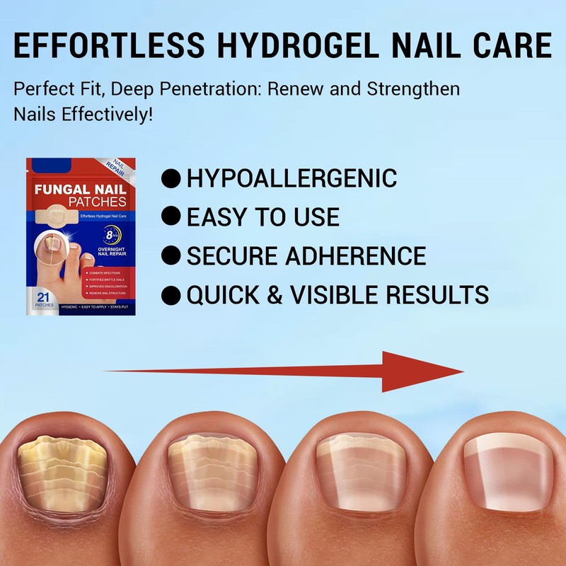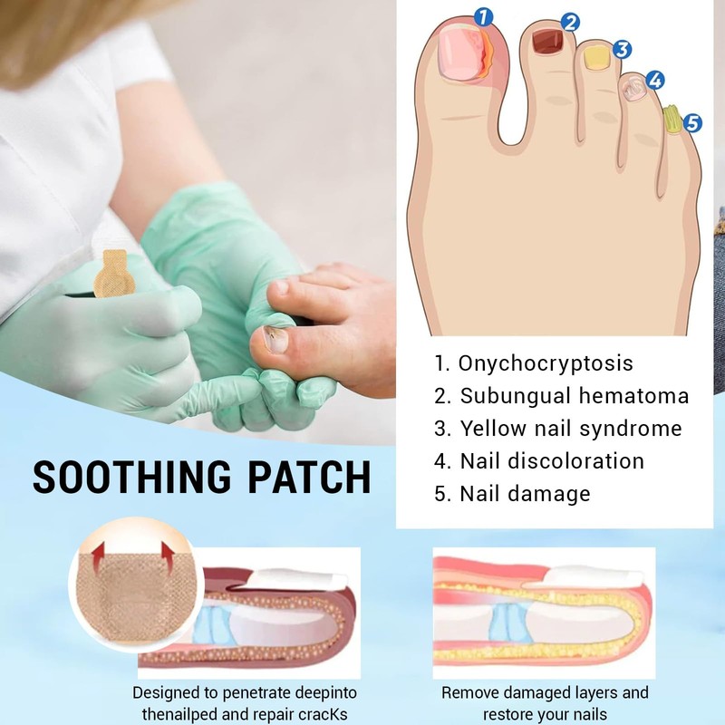 Directions: Before use, clean and dry the area to be used. Remove the protective film and peel off the release paper from the patch. Place the sticky side of the patch directly on the nail. Gently fold the sides of the patch around the toe or finger to ensure a secure adhesion. Leave the patch in place for 6-8 hours or overnight