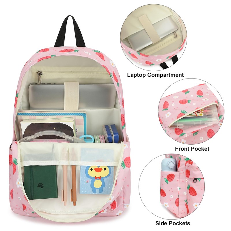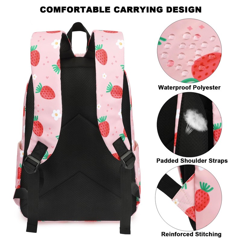 Xunteny Strawberry Girls School Backpack for Kids Teens, Elementary Middle School Backpacks Bookbag Set with Lunch Bag Pencil Case