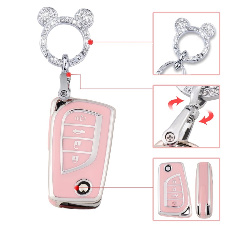 XUPEIXUN 3 Pcs Pink Car Accessories for Toyota Fortuner Tundra Camry RAV4 Highlander Corolla Key Fob Cover with Bling Keychain Cute Push to Start Stop Button Cover