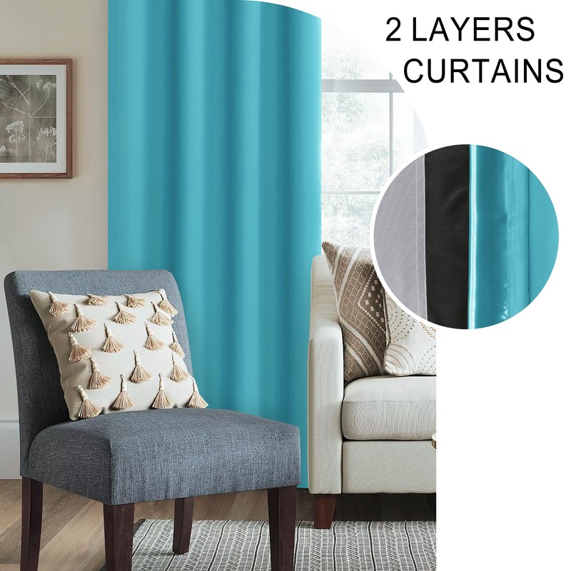 XWZO 100% Blackout Curtains 84 Inches Long with Tiebacks- Privacy Protection & Noise Blocking Window Draperies Grommet Top with Black Liner for Bedroom/Living Room, Turquoise, W60 x L84, Set of 2