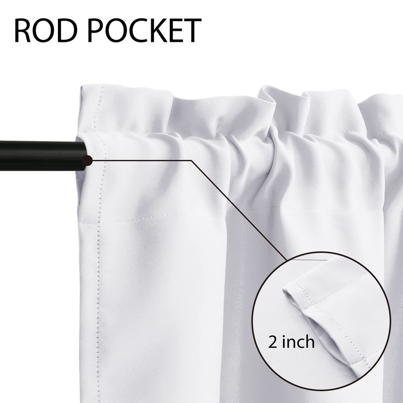The top of each short curtain is designed with 2 inches rod pocket for easy to install and slide. 2” rod pocket can easily fit any standard rod