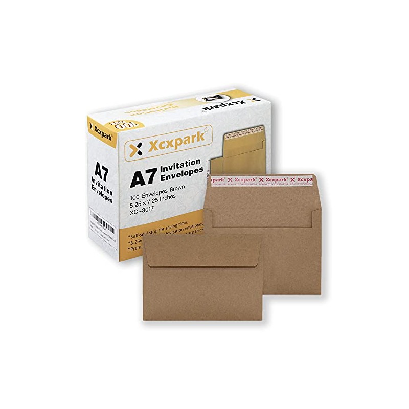Xxcxpark 100 Qty Printable A7 Invitation Envelopes 5.25X7.25 inches Cards, Self Seal 120GSM Brown Kraft Paper Envelopes for Invitations, Papers, Photos, Documents, Wedding, Baby Shower, Easy to Seal