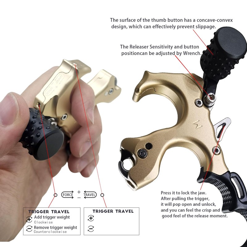 - [Adjustable Design]--The Archery release sensitivity can be easily adjusted with the wrench, ensuring good operation and preventing hand injury.Ergonomic design.For most hand sizes. Adjustable orientation of thumb release device,for left and right handers.