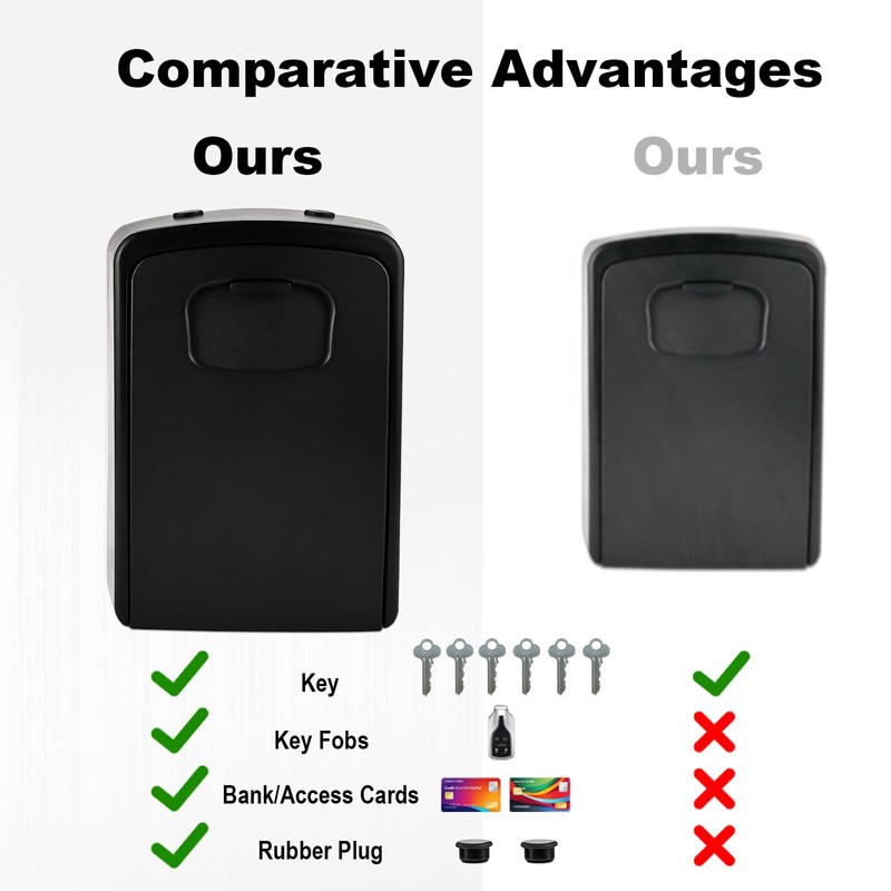 • 【Widely used】--The outdoor key lock box design provides ample space to store keys, bank cards, USB flash drives, and more. Lock boxes are suitable for realtor, cleaners, and pet caretakers to hide a key outside. It is also suitable for apartments, garages, gardens, shops, homes, supermarkets, companies, warehouses.