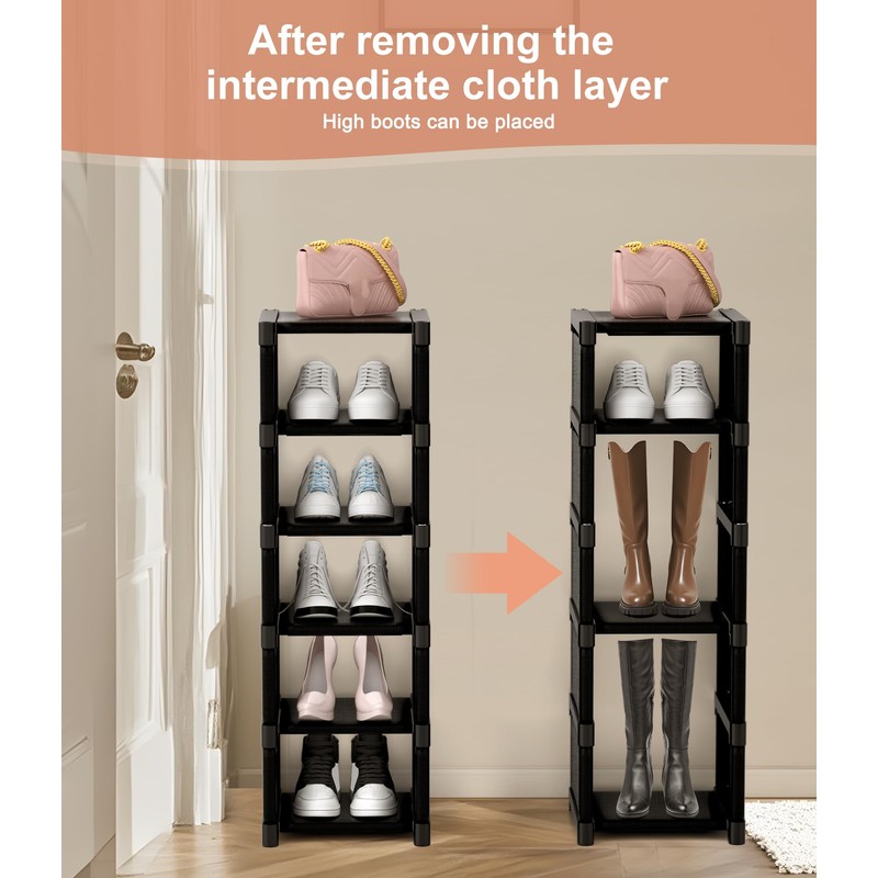 - 【Easy Assembly & Personalized Storage】Assemble this shoe rack no tools needed, simply assemble the unit by hand with provided parts. You just need to thread the tubes through the non-woven fabric layer, and then insert them into the plastic connector. Assemble these components vertically, then it's OK. You can also remove the middle layer to adjust the height, making it possible to accommodate tall boots