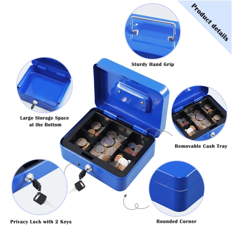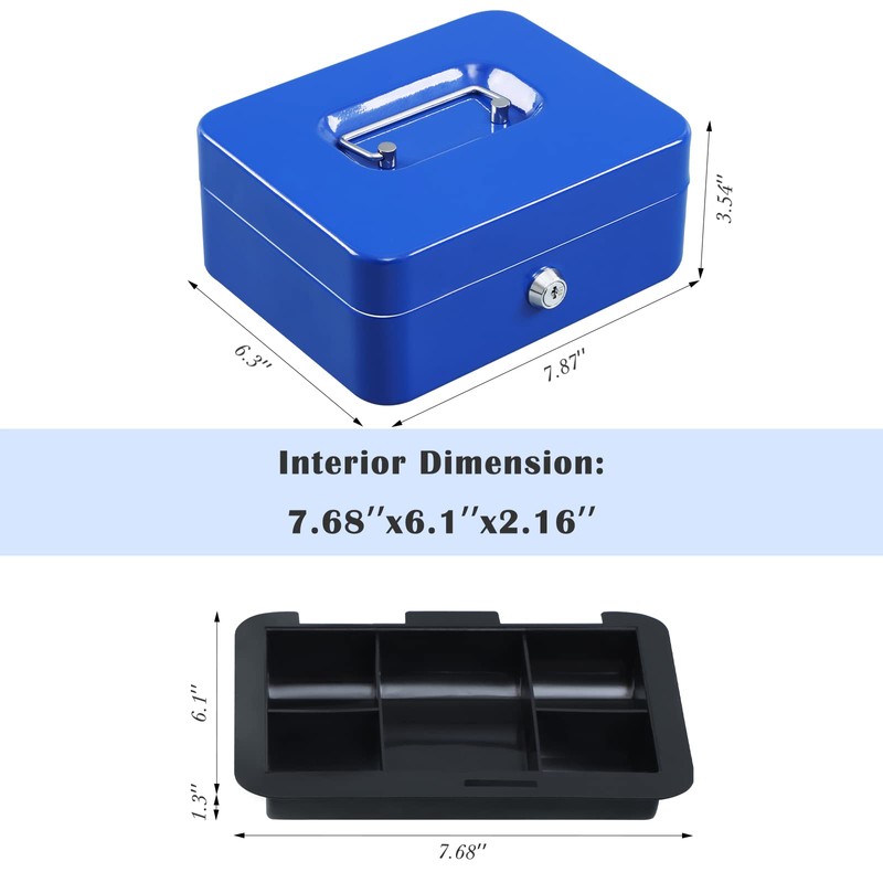 xydled Locking Steel Medium Cash Box with Removable Coin Tray and Key Lock,7.87"x 6.30"x 3.54",Blue