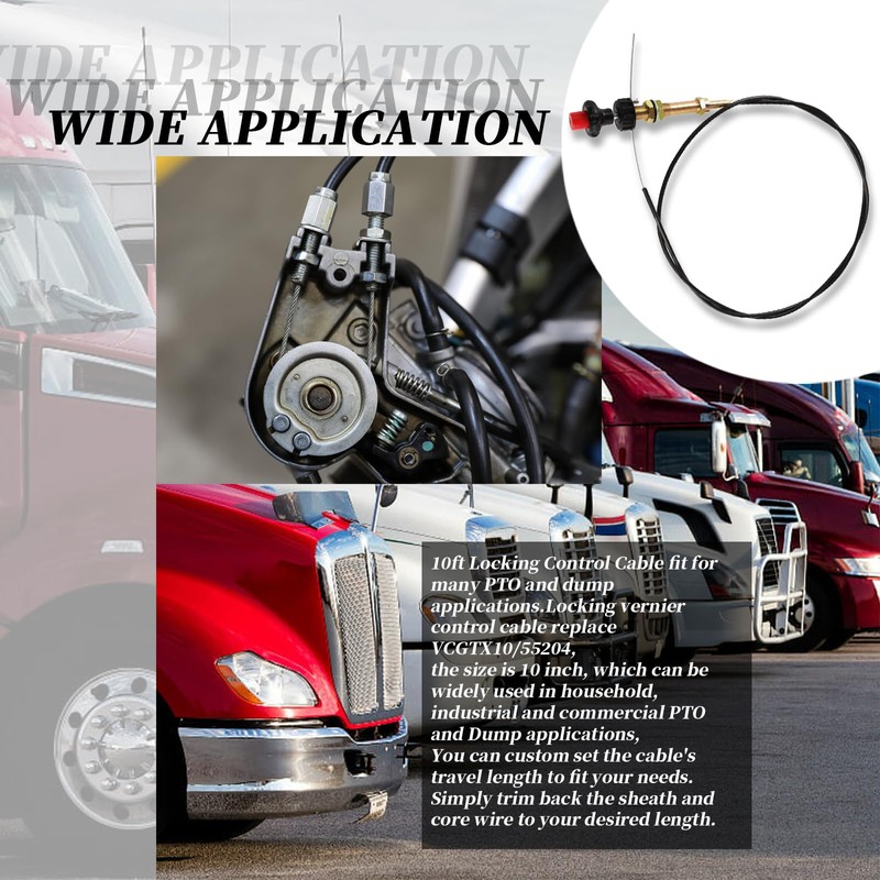 • [WIDE APPLICATION]:10ft Locking Control Cable fit for many PTO and dump applications.Locking vernier control cable replace VCGTX10/55204, the size is 10 FT, which can be widely used in household, industrial and commercial PTO and Dump applications, You can custom set the cable's travel length to fit your needs. Simply trim back the sheath and core wire to your desired length.