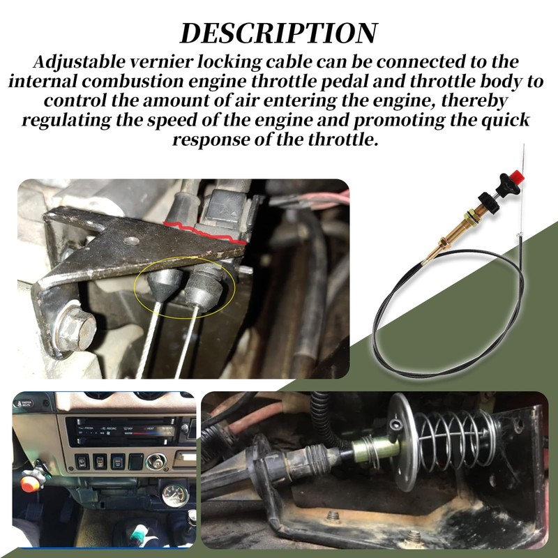 • [DESCRIPTION]:Adjustable vernier locking cable can be connected to the internal combustion engine throttle pedal and throttle body to control the amount of air entering the engine, thereby regulating the speed of the engine and promoting the quick response of the throttle.