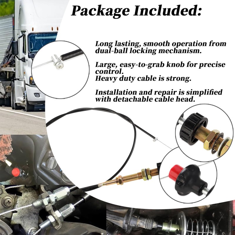 • [EASY TO INSTALL]:10ft Truck Equipment Locking Control Cable is easy to use and install, and its detachable head makes adjustments fast and simple.Features push-pull control, lock, and fine vernier for precise control. Solid 0.088 inch stainless steel core. 0.375 inch diameter conduit. Mounts in a 3/4 inch panel hole.Adjustable Locking Control Cable with a removable head for quick and simple adjustments.