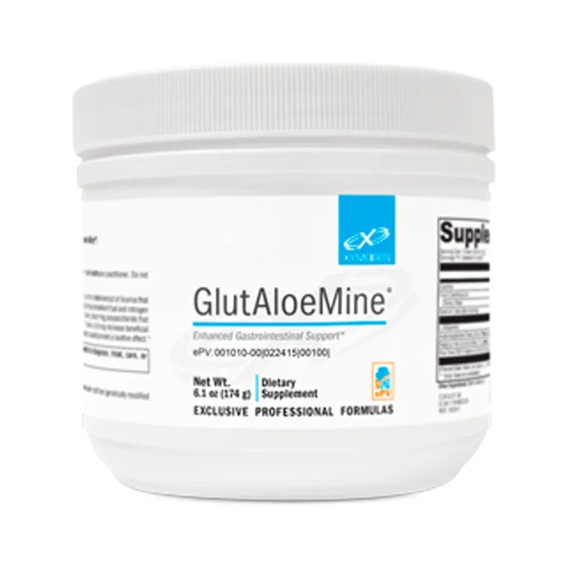 Xymogen GlutAloeMine (174 g) es un suplemento en polvo orgánico y vegano con glutamina, aloe vera y NAG, que proporciona apoyo gastrointestinal integral, repara la barrera intestinal y tiene un efecto calmante y antiinflamatorio, siendo libre de gluten y lactosa.