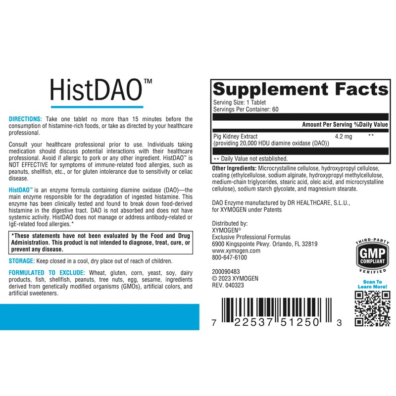 XYMOGEN HistDAO - DAO Enzyme Supplement to Supports Healthy Degradation of Food-Derived Histamine - Diamine Oxidase for Digestive Health 20,000 HDU Per Serving (60 Tablets)