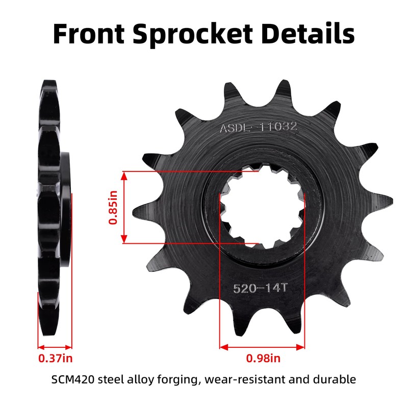- Enhanced Acceleration and Power Transfer: With a front sprocket of 14 teeth and a rear sprocket of 43 teeth, our chain and sprocket kit optimizes gear ratios, allowing for improved acceleration and smooth power transfer to enhance your riding experience.