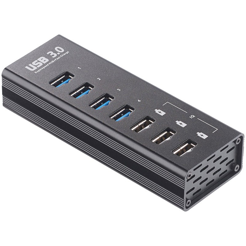 - 4-way hub with SuperSpeed USB 3.0 up to 5 Gbit/s 3 additional USB ports with BC 1.2 fast charging function Total up to 4 A charging current (via power supply) Slim aluminium housing
