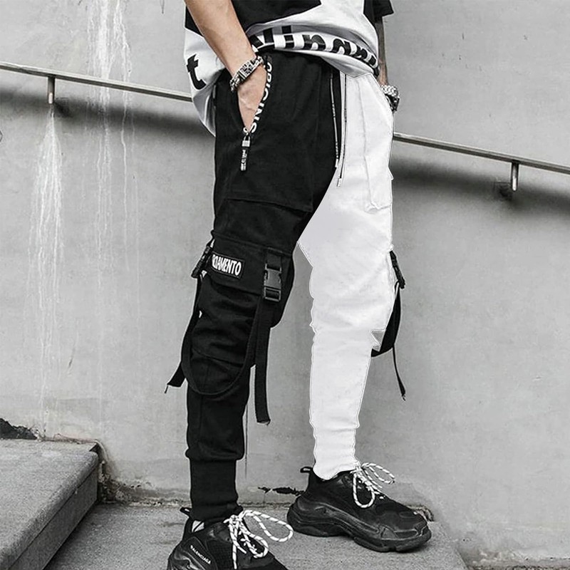 XYXIONGMAO Men's Jogger Techwear Pants Hip Hop Goth Streetwear Harem Sweat Tactical Track Multi Pocket Black Joggers Cargo Cool Baggy Pants(Black&White,2XL)