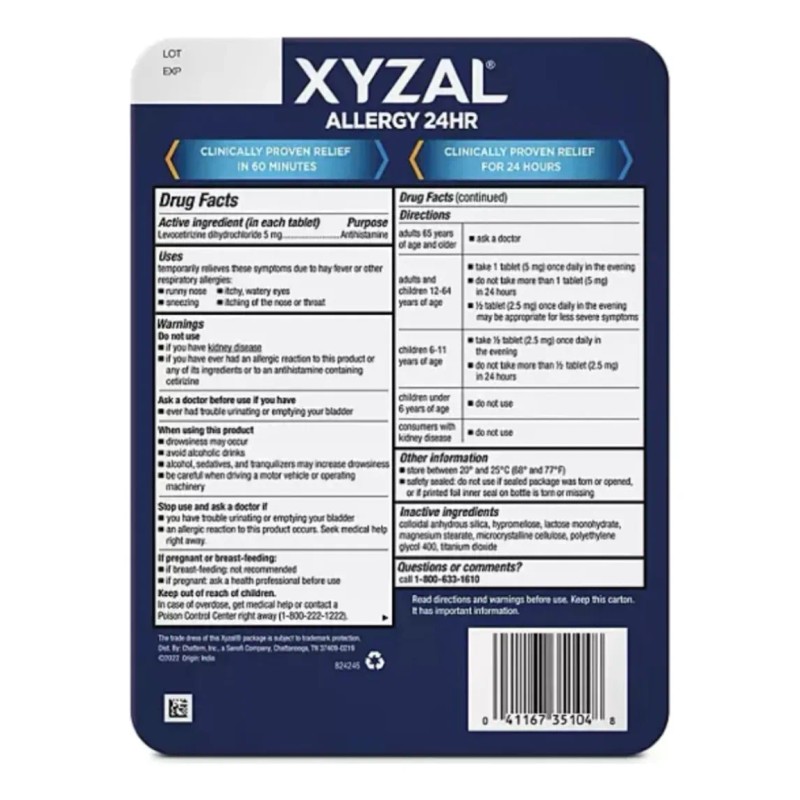 Descubre la libertad de disfrutar cada momento sin preocuparte por las alergias. Xyzal Allergy 24 Horas, con sus 110 tabletas, es tu aliado perfecto contra esas molestas reacciones alérgicas que te impiden vivir al máximo. 🌟