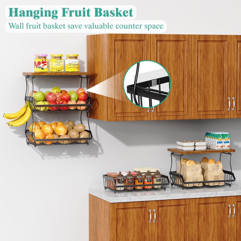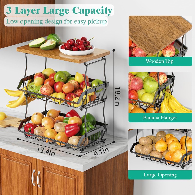 - Large Capacit:3-Tier large fruit bowl vegetable basket with wooden top to hold various sized fruits, such as banana, apples, oranges, snack, or potates and onions.