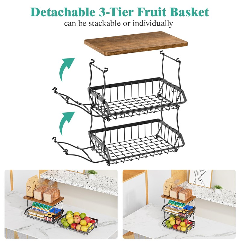 XYZLVSI 3 Tier Countertop Fruit Basket Bread Bowl with Wooden Top for Kitchen, Stackable Vegetable Potato Onion Storage Wire Basket with Banana Hangers, Black