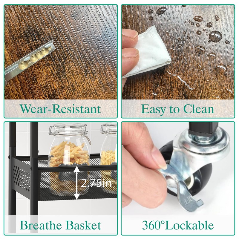 - Large Storage Capacity:4 tier rolling cart trolley features three mesh baskets and a wooden top, offering ample space to store all your essentials. It is ideal for organizing kitchen fruit and vegetable, onions and potatoes, spice jars, or bathroom and laundry supplies, even office necessities.