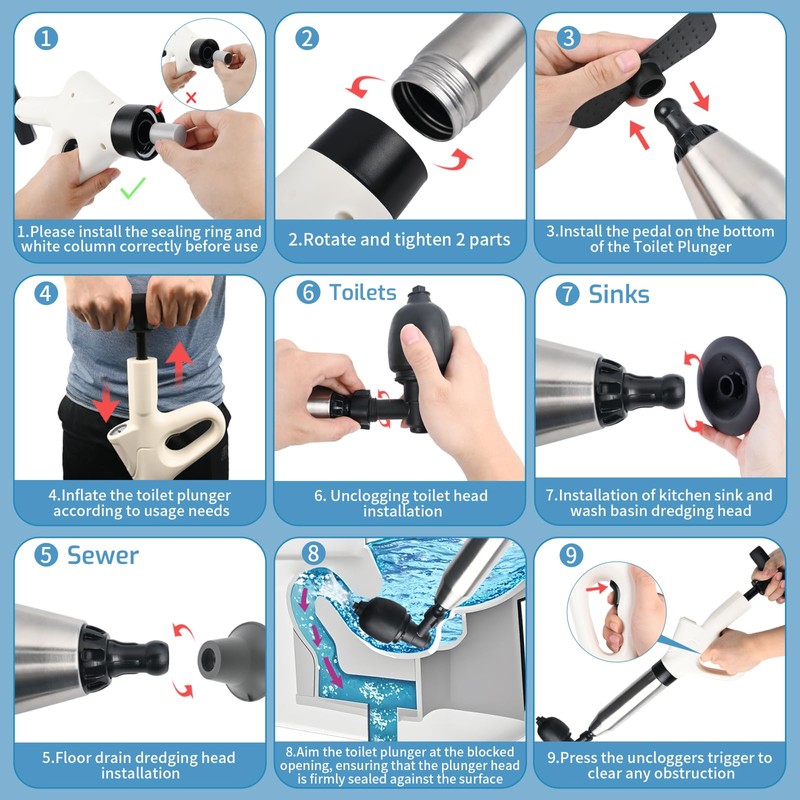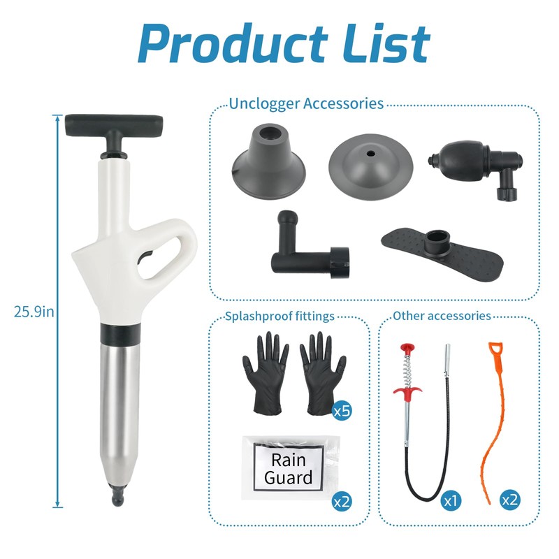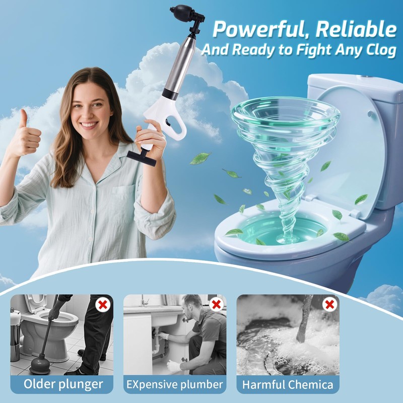 - EFFICIENT UNCLOGGING: Harness the power of advanced air compression to blast away stubborn clogs in seconds. From hair and grease to food scraps and small objects, this high-pressure tool clears blockages effortlessly—outperforming traditional plungers