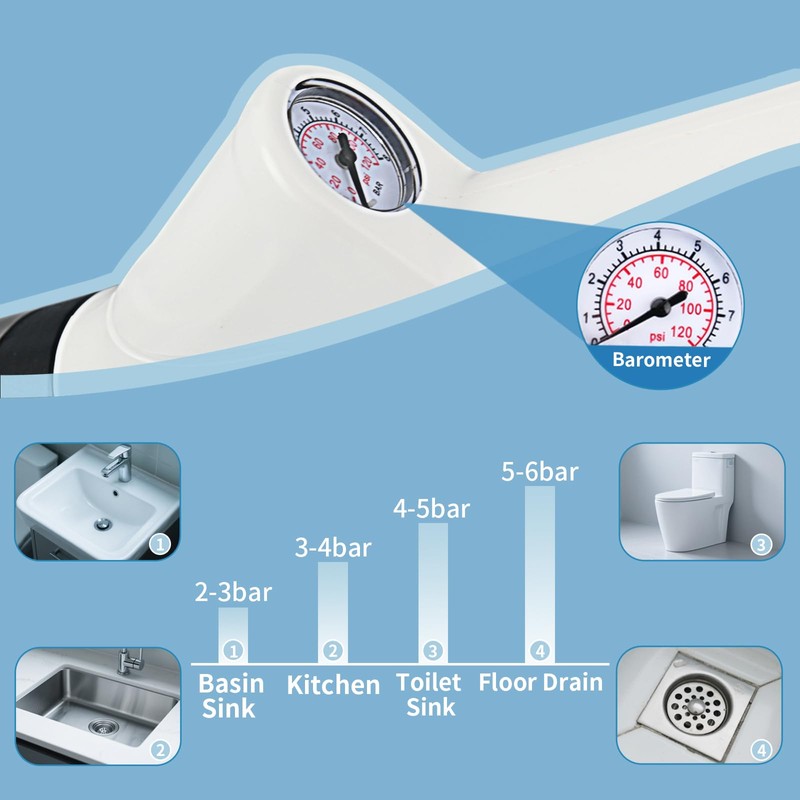 - REAL-TIME PRESSURE CONTROL: Stay in control with an easy-to-read pressure gauge that lets you adjust for any clogging condition. Prevent splashes and ensure safe, effective use by following recommended pressure levels: 1-3 Bar for sinks, 3-4 Bar for kitchens, 4-5 Bar for toilets, and 5-6 Bar for floor