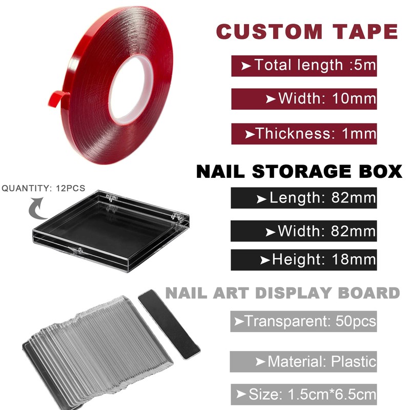 • 🌟【Nail Packaging Box Set】: You will receive a perfect press-on nail packing box set, including 12pcs packing boxes, 50pcs transparent nail stand holders, and 1 roll of 5m long double-sided tape, sufficient quantities will meet your daily requirement. Please note that false nail tips are not included.