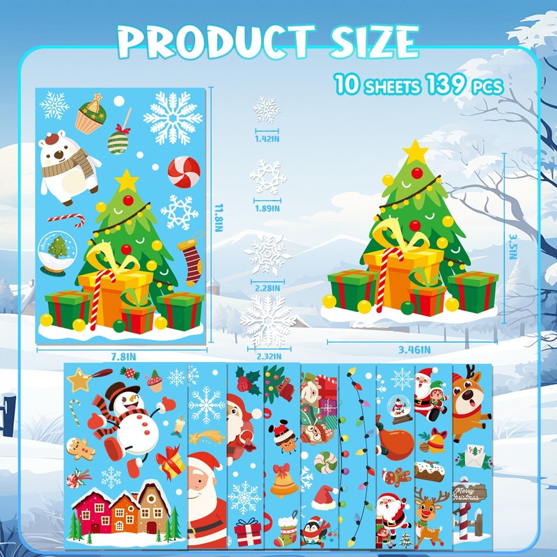 - Full Set Of Christmas Window Stickers:This set includes 10 sheets with 139pcs Christmas window stickers featuring Santa Claus, Christmas trees, reindeer, snowmen, gift boxes, snowflakes, Christmas elves, and more. Perfect for Christmas window clings, window Christmas decorations, and holiday window clings for glass. Bright colors and detailed designs make these Christmas decals ideal for creating a cheerful, festive atmosphere at home, classrooms