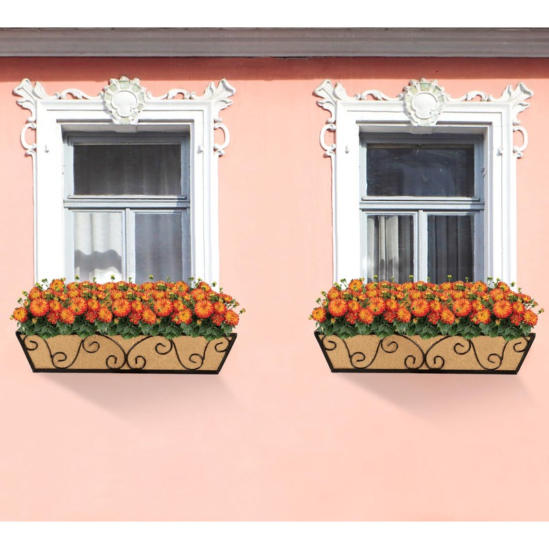 - An intricate metal frame features cut-out quatrefoil patterns in black as the included coco fiber liner provides hydration and sufficient drainage. Create a lovely floral display from a window or on a deck using this planter box.
