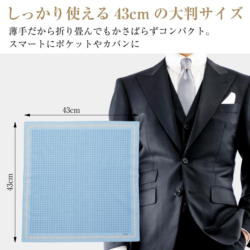 - [使用シーン] ビジネスシーンにおいて、清潔感のあるシックなデザインは、あなたのプロフェッショナルな印象をさらに高めます。 43cmの大判サイズでありながら、薄手でコンパクトに折りたためるため、ポケットにスマートに収納でき、日々の忙しさの中でもポケットからの出し入れをスムーズにします。 耐久性に優れた綿素材は、濡れても弱くなりにくく、洗濯を繰り返しても素材が傷みにくいため、長くご愛用いただけます。 このハンカチは、紳士のたしなみとしてのみならず、日々の生活を豊かに彩るアイテムです。 ビジネスはもちろん、カジュアルなどさまざまなシーンやお洋服にオールシーズン幅広くご使用いただけます。 高級感があり、上品なデザインなので、結婚式などのフォーマルなシーンにもご利用可能です。