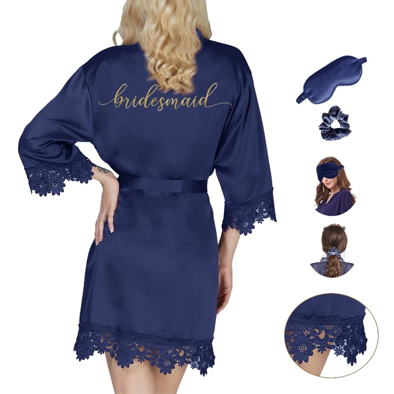 - Design: Silk satin lace robes, eye masks and scrunchies in matching color. One set with total 3 pieces. Exquisite Monograms Printing 'Bridesmaid' or 'Bride' on the back of the lace robes for wedding Party and Bridal Site. Inner layer with its own satin fabric drawstring and its own satin waistband, perfectly showing the beauty of women, soft and comfortable, delicate and smooth.