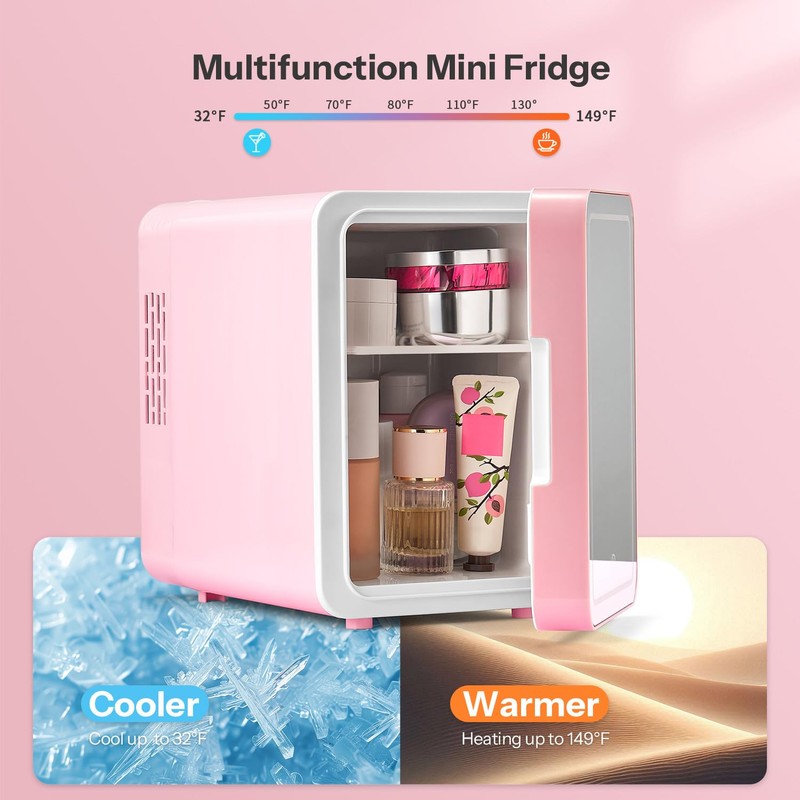 - 6L Smart Skincare Fridge with Dimmable LED Mirror - Dual Mode Cooler & Warmer - Portable Mini Fridge for Cosmetics, Drinks & Snacks - Elegant Pink, by Yabano