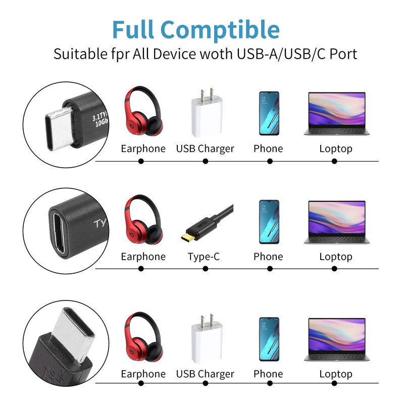 - 【High Compatibility】USB C extension adapter is suitable for all interfaces and devices with Type C, such as laptop/PC, tablet, mobile phone, charging cable, charger, earphone, hard drive, flash drive, USB hub, power bank , keyboard, mouse, gamepad, etc.