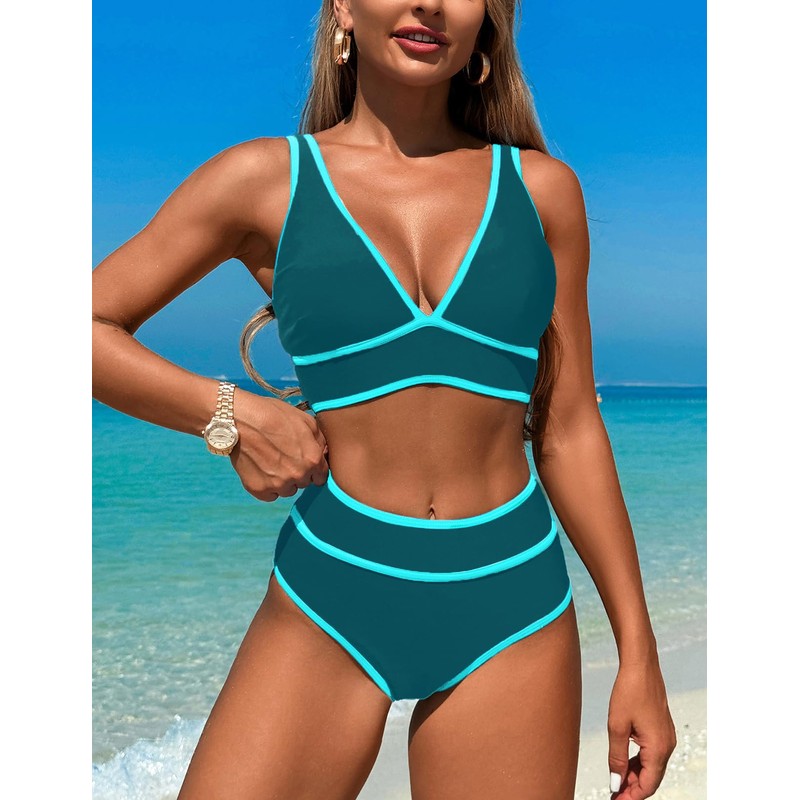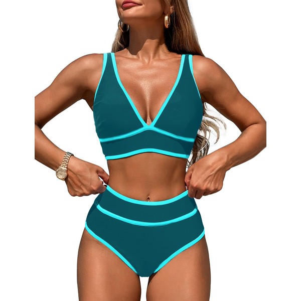 YACUN Womens High Waisted Bikini Sets Two Piece Color Block Bathing Suits Deep V Neck Swimsuits Teal Blue XL