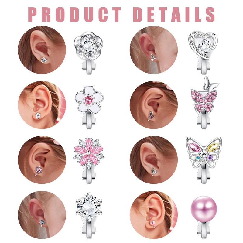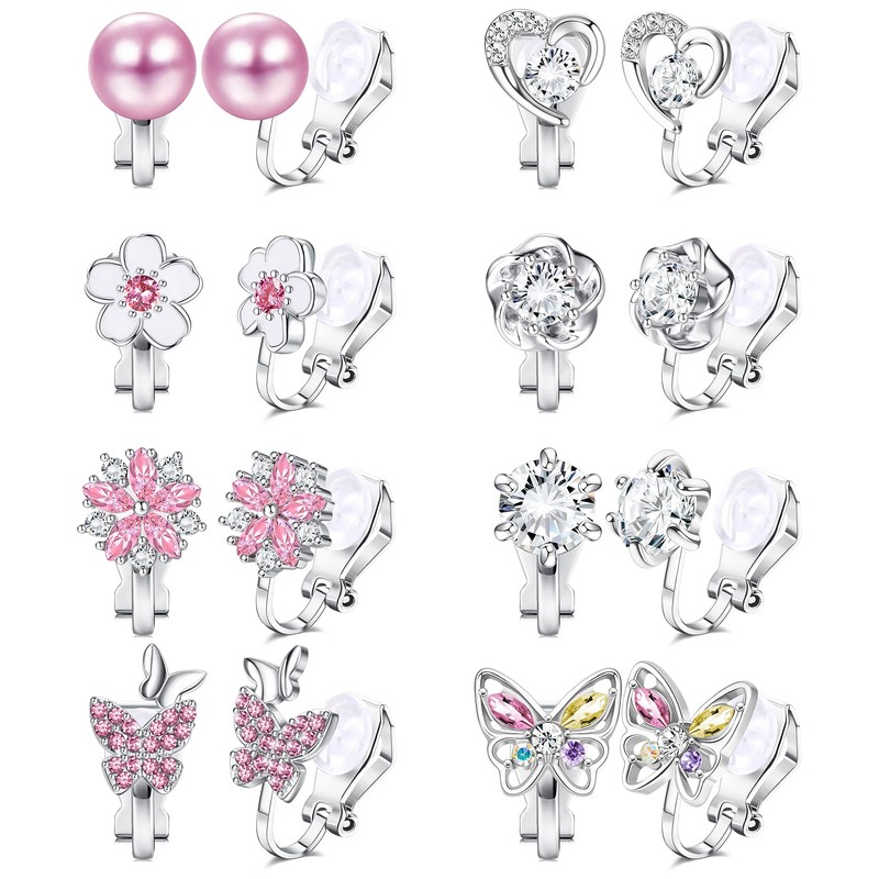 - Clip on earrings for women and girls. One order contains 8 pairs of glittering clip-on earrings for girls in a delicate and attractive design. Choose from two styles in pink and purple, including clip butterfly earrings, heart clip earrings, pearl clip earrings, flower clip earrings and more.
