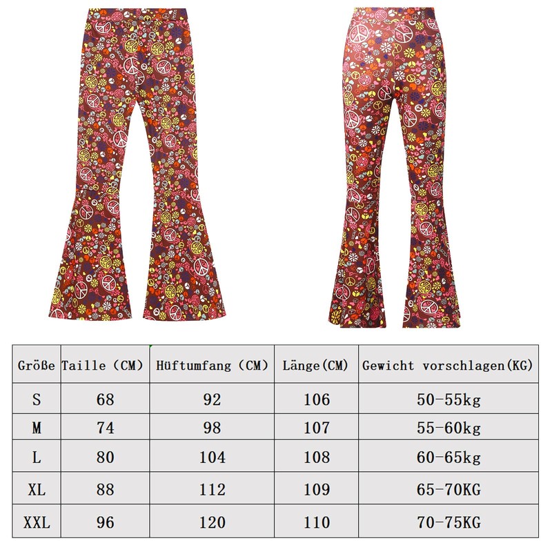 - 【Hippie-Kostüm-Damen-Hosen-Set】 - Dieses Paket enthält 1 Paar Hippie-Schlaghosen, 1 Stück Peace-Zeichen-Ohrringe, 1 Stück Peace-Zeichen-Halskette, 1 Stück Blumen-Stirnband und 1 Stück Vintage-Sonnenbrille. Eine auffällige ausgestellte Hose und das Passende Hippie-Kostümzubehör ist perfekt für jede Veranstaltung zum Thema 60er 70er Jahre.