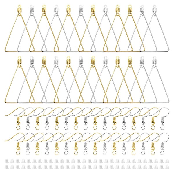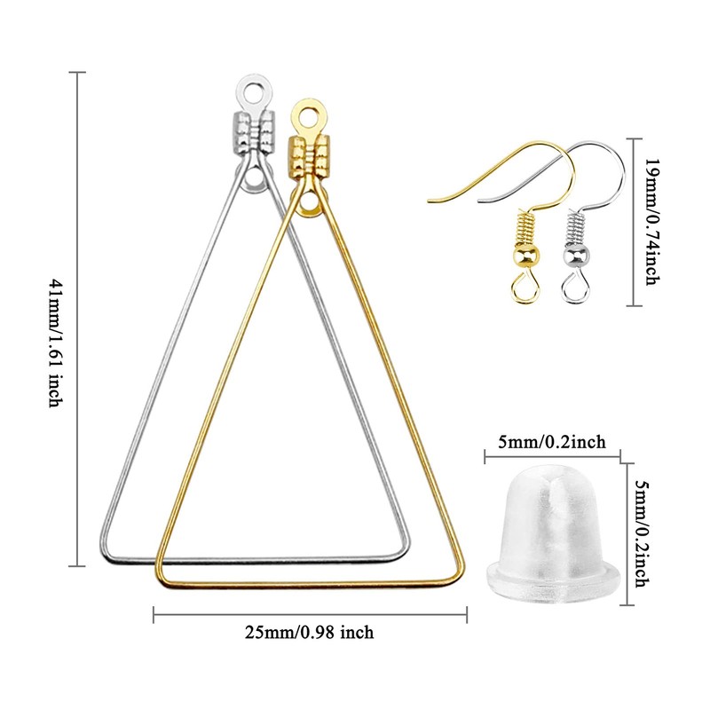 - [ Package Includes ] There are 40 pieces beading hoop earrings, 20 pieces each in k gold and white k earrings, 50 pieces each of k gold and white k earring hooks and 100 pieces of silicone earring backs. The exquisite triangle earrings are very suitable for handmade DIY earrings. ( NOTE: The top of triangle earrings cannot be opened, but there is a small hole in the middle of the top for hanging accessories. )