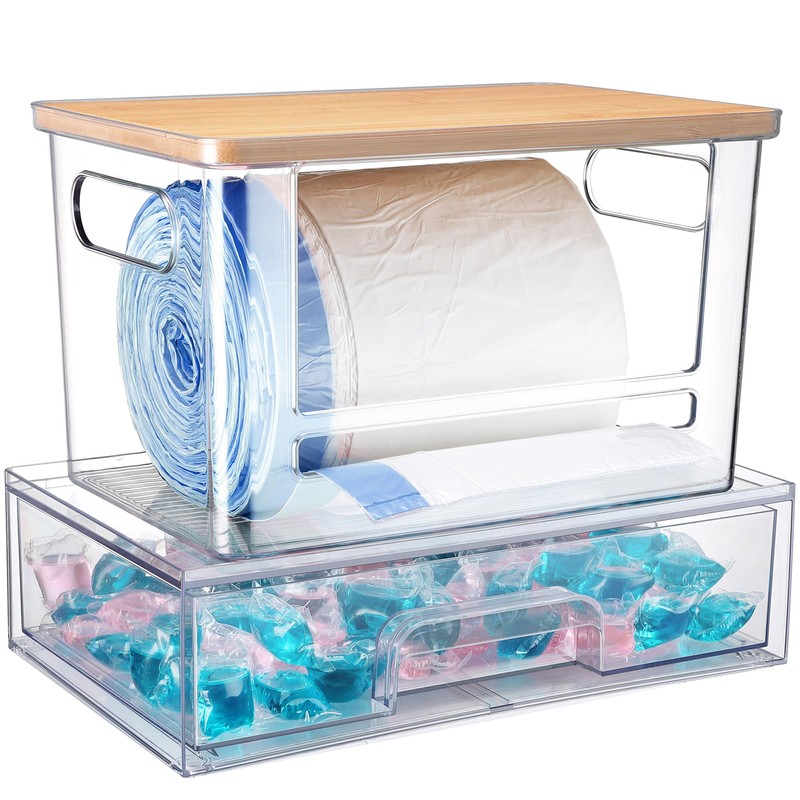 - LAUNDRY ROOM ORGANIZATION SET: you will receive Trash Bag Organizer Dispenser + Laundry Pod Containers, Multi-functional storage containers is suitable for Kitchen, Laundry Room, Toilet, Under Sink, Closet, Countertop, etc., you can store laundry supplies, cleaning supplies, vegetables and fruits, snacks, etc. Very practical and space saving