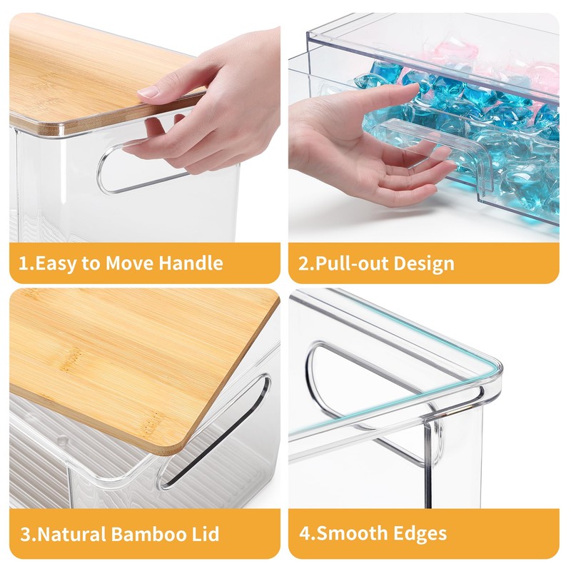 - MULTIFUNCTIONAL DESIGN: The Trash Bag Organizer Under Sink has a large front opening and a removable bamboo lid for easy access to items. Trash bag has handles on both sides for easy movement. laundry pod holder has a pull-out design for easy access to items