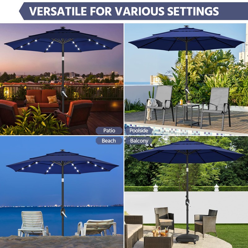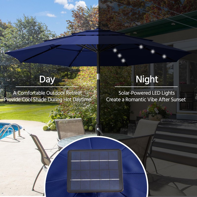 Yaheetech 10ft 3-Tier Vented Solar Patio Umbrella, Table Outdoor Market Umbrella with 24 LED Lights, 8 Sturdy Ribs Beach Umbrella with Tilt and Crank for Garden, Deck, Navy Blue