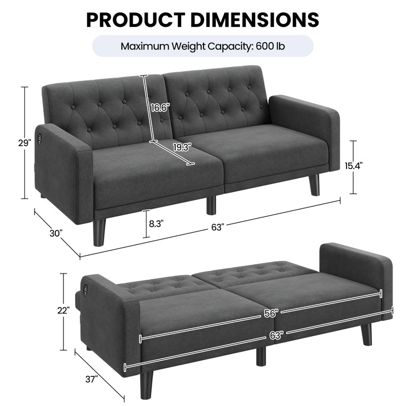 Yaheetech 63" Convertible Couch Small Futon Sofa Bed with 2 USB Ports, Reclining Backrest & Removable Armrests, Mid Century Modern Loveseat for Living Room, Apartment, Office, Dark Gray