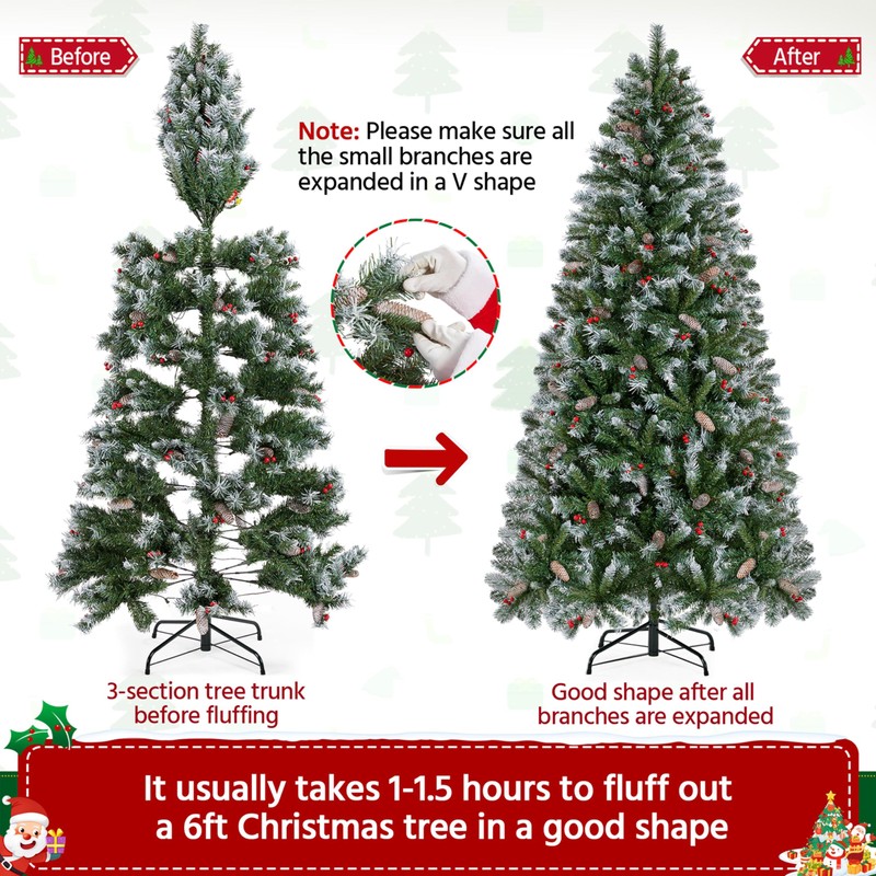 - Pre-decorated with Berries & Pinecones: Adorned with evenly distributed holly berries, white-tipped pinecones, and frosted tips, this Christmas tree allows you to dive into the spirit of the season