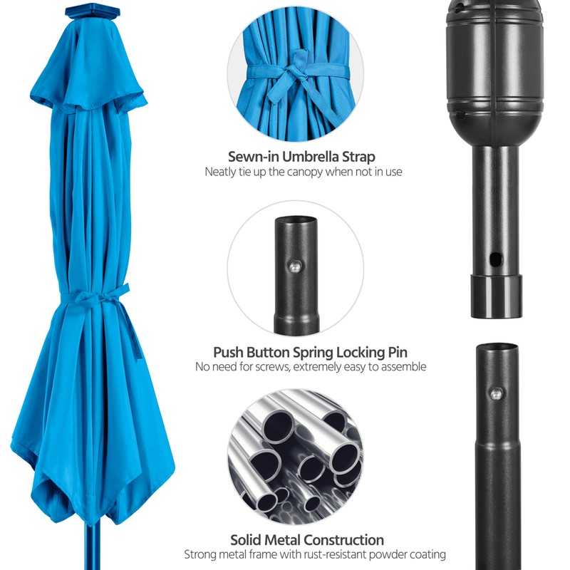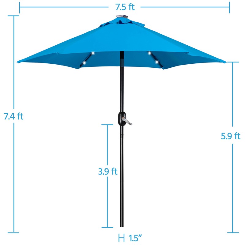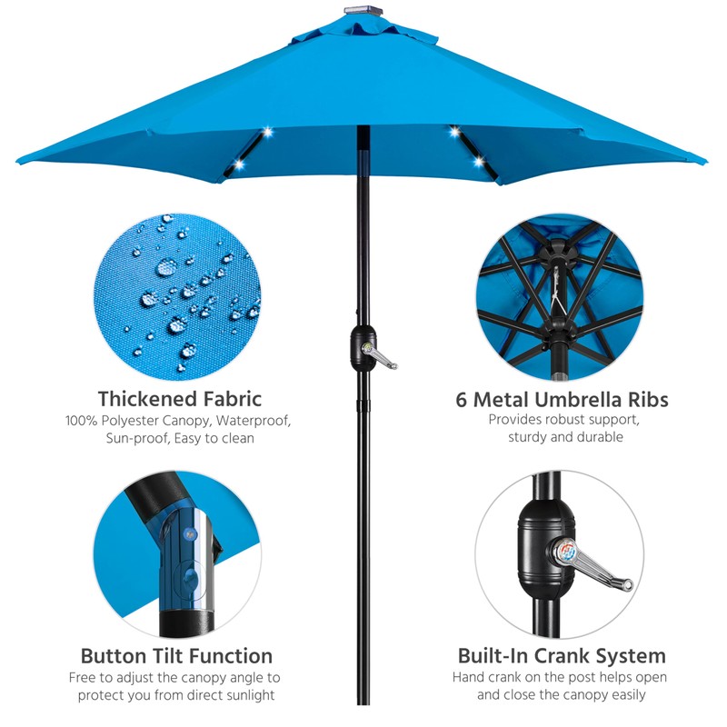 - Convenient-To-Use: With 2 simple assembly steps, this patio umbrella will offer a decent shade over a 36” or smaller patio table with 2-4 chairs on hot summer days. Its user-friendly features like the crank lift, push-button tilt adjustment and solar-powered LED lights maximize your enjoyment