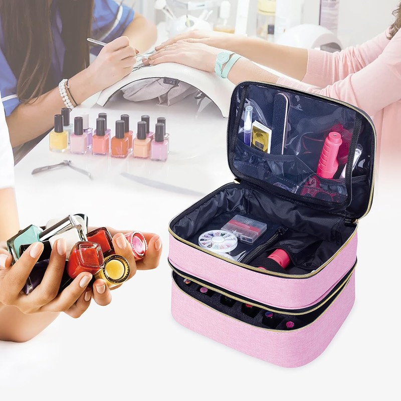 YAHOURWAT Nail Polish Organizer Bag Double Layer Capacity Portable Travel Storage Case Holds 30 Bottles (15 ml/0.51 floz) Nail Supplies Holder Bag Designed for Women's Nail Tools Pink
