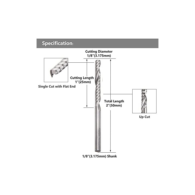 • Type: Spiral (Upcut), Cutting Type: Single Flute with Flat End, Shank: 1/8" (3.175mm), Cutting Diameter: 1/8" (3.175mm), Cutting Length: 1" (25mm), Overall Length: 2" (50mm)