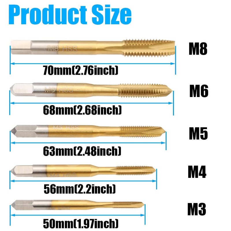 Yakamoz 5pcs Machine Screw Thread Tap Set HSS Titanium Spiral Flute Drill Taps Metric M3 M4 M5 M6 M8 Thread Tapping Too