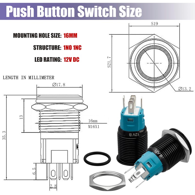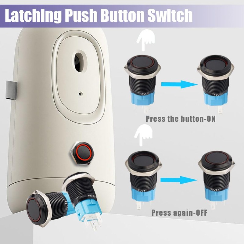 • Versatile SPDT Latching Switch: 16mm latching push button switch with 1NO and 1NC terminals, perfect for marine, PC, or automotive applications.
